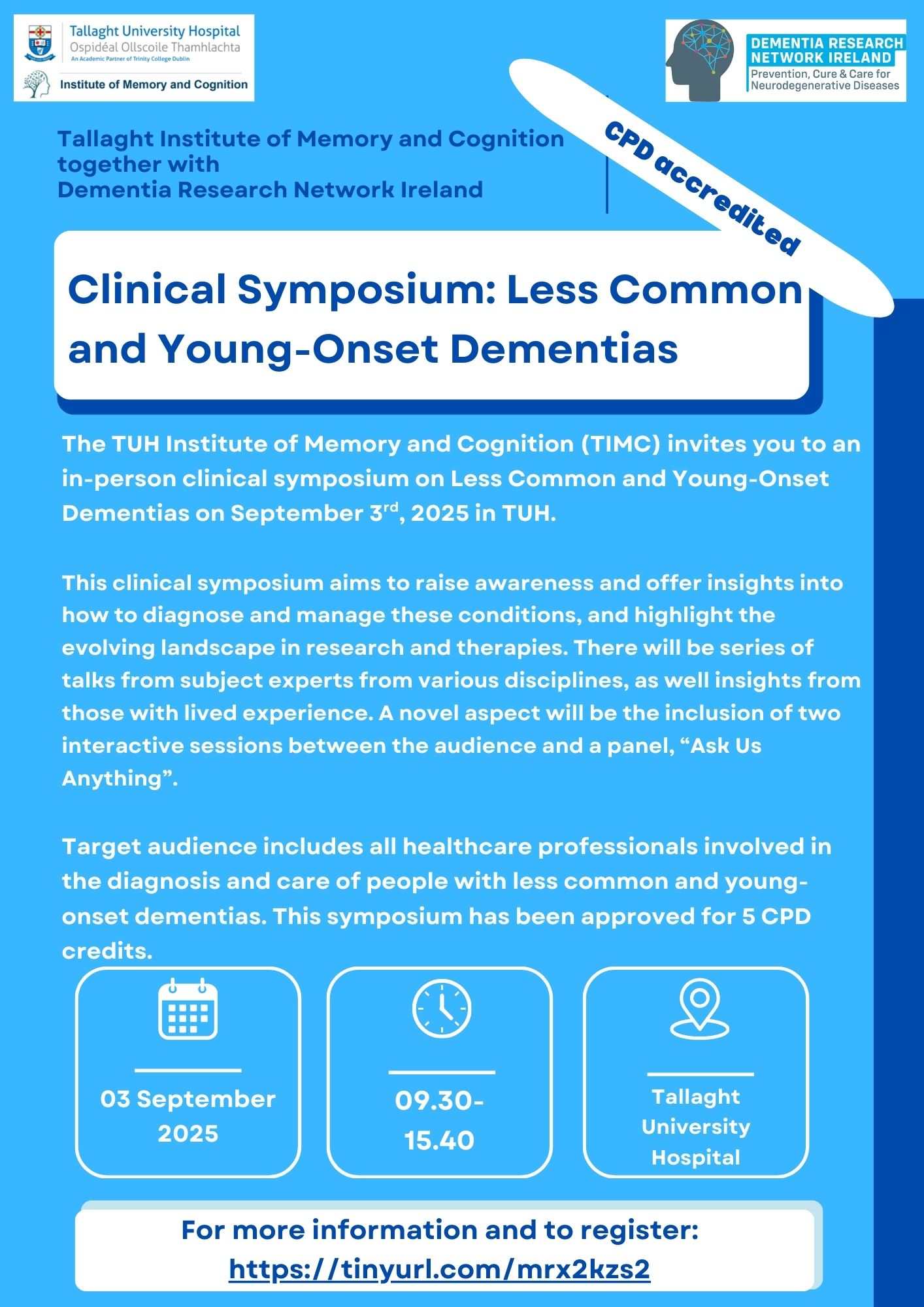 The TUH Institute of Memory and Cognition (TIMC) together with Dementia Research Network Ireland invites you to attend an in-person Clinical Symposium on Less Common and Young-Onset Dementias on Wednesday September 3rd, 2025 in the Centre for Learning and Development, Tallaght University Hospital.&